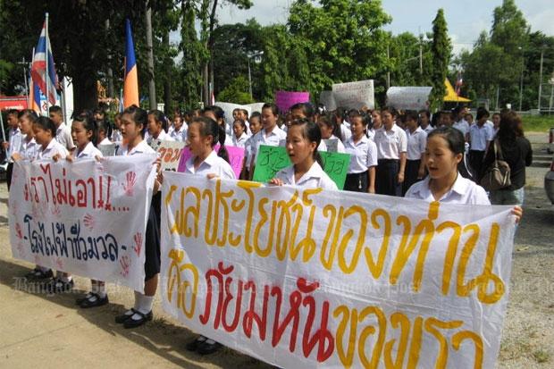 Maar er worden maar weinig vorderingen geboekt; uit lethargie, zeggen mensen uit het bedrijfsleven en actievoerders. De belangrijkste knelpunten zijn een gebrek aan publieke participatie en de vrijstelling voor centrales van minder dan 10 MW van een milieu-effectrapportage [die hoorzittingen verplicht stelt]. Als gevolg daarvan verzetten bewoners in Nan, Chiang Rai, Chachoengsao en andere provincies zich. Op de foto een leerlingenprotest in Nan. Daar is een centrale pal tegenover de school gepland.