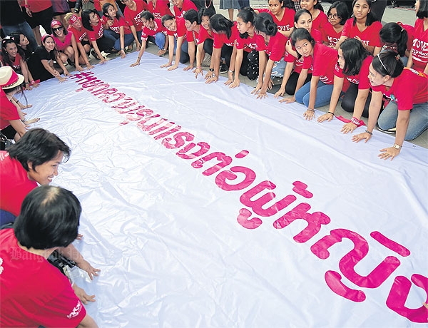 Foto: Een vrouwengroep heeft voor het Bangkok Art and Culture Centre een spandoek uitgerold met de tekst Stop Geweld Tegen Vrouwen.
