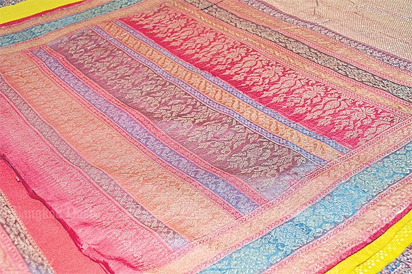 Foto’s onder: Weefsels van Muang Nakhon goudbrokaat en het weefgetouw dat door vijf personen wordt bediend.