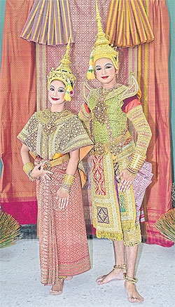 Foto rechts: Phra Ram en Sita in een kostuum van goudbrokaat.