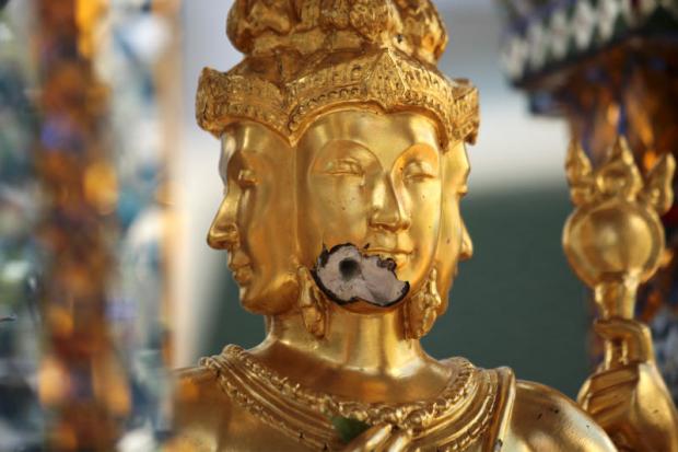 Het beeld van de oppergod en schepper Brahma (met de vier gezichten) in de Erawan Shrine is bij de bomaanslag licht beschadigd. De kin is gebroken, het beeld is op twaalf plaatsen geraakt en een ruit is gebroken. Maandag beginnen reparatiewerkzaamheden door het Fine Arts Department. Die zullen ongeveer twee weken in beslag nemen. Het werk kan ter plaatse worden uitgevoerd.