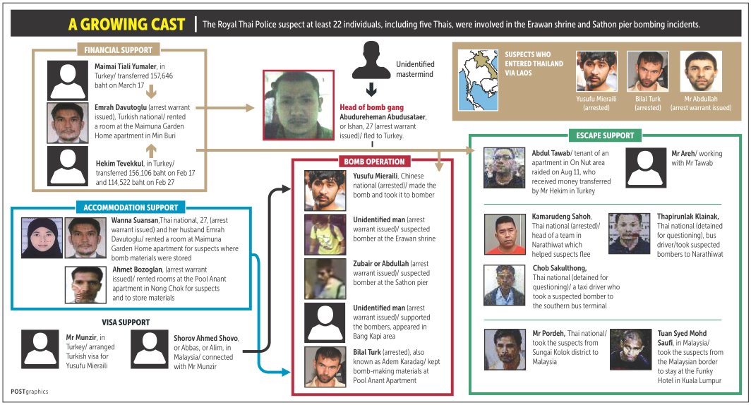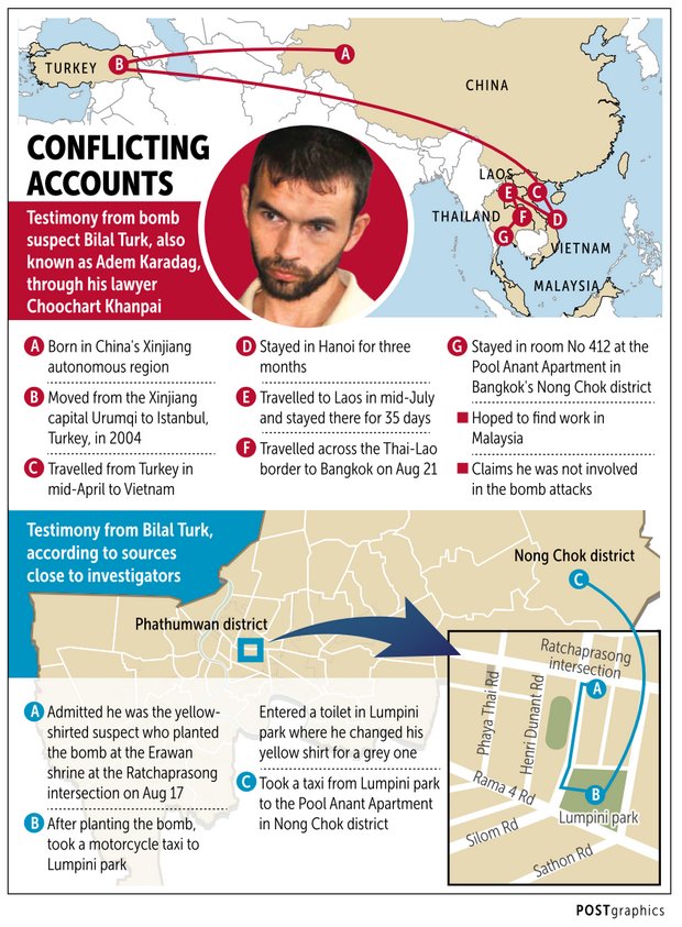 - De hoofdverdachte van de bomaanslag bij de Erawan Shrine, Adem Karadag (ook Billal Turk) heeft zijn advocaat verteld dat hij de bom in opdracht van Abdullah Abdulrahman heeft geplaatst. Als beloning zou hij via Maleisië naar Turkije kunnen gaan waar familie en bekenden van hem wonen.