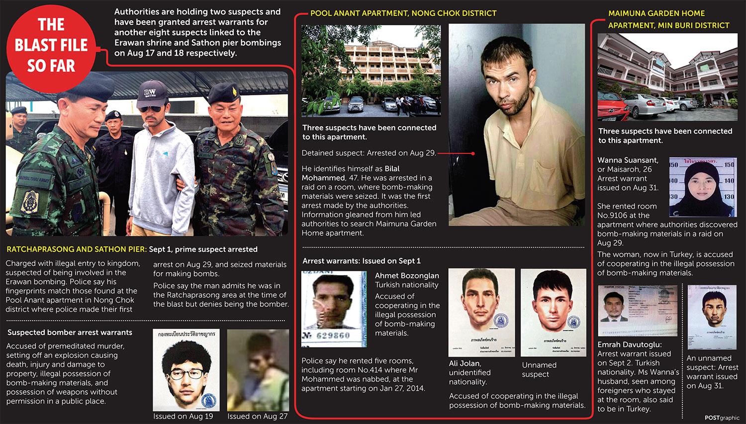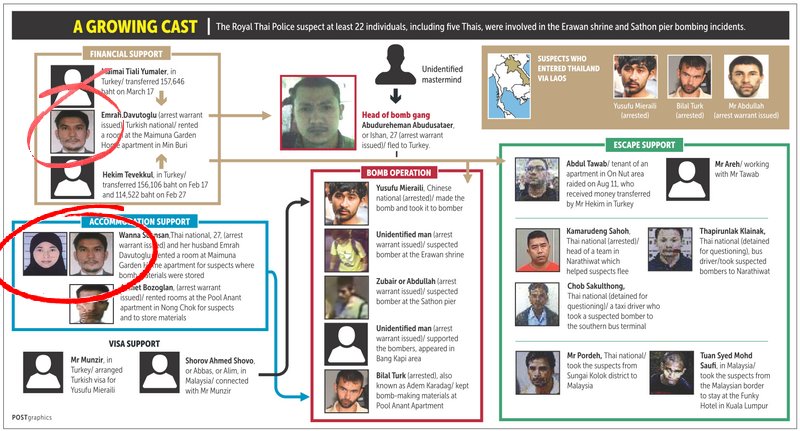 Van betrokkenheid bij de bomaanslag worden 17 personen verdacht, van wie dus nu 3 zijn gevangen gezet. De twee daders zijn in afwachting van berechting in november 2015 aangehouden. Wanna, afkomstig uit Phangnga, zegt onschuldig te zijn. Ze zou alleen een appartement in Bangkok hebben gehuurd maar de huur een jaar geleden hebben opgezegd. In het appartement zijn explosieven gevonden. In mei 2015 vertrok het echtpaar naar Turkije.