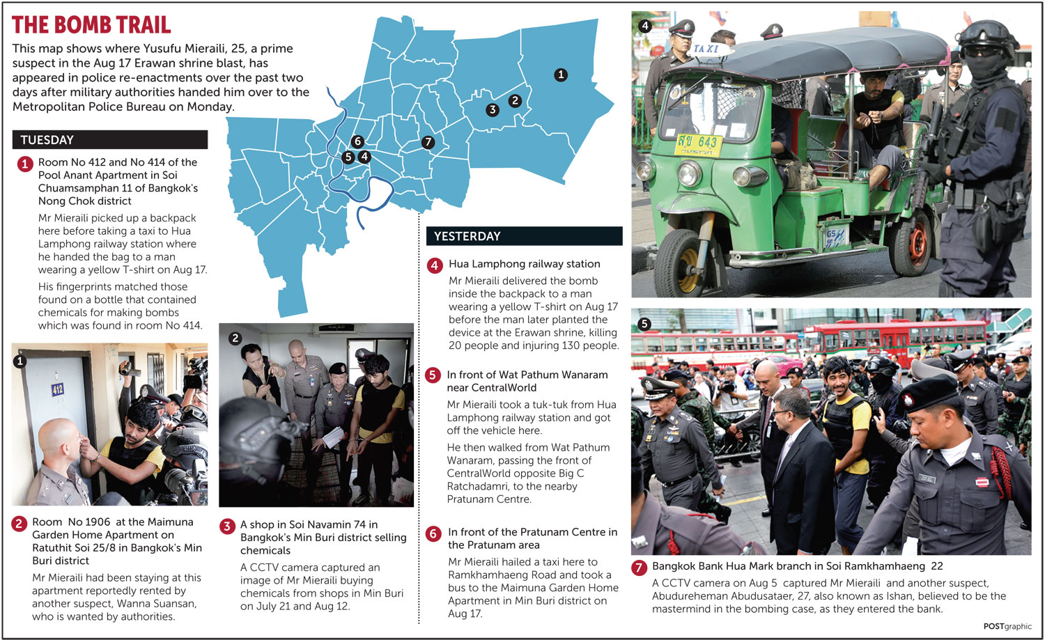 De motortaxibestuurder bij wie de verdachte achterop stapte, nadat hij zijn rugzak had achtergelaten onder een bank bij de Erawan Srine, heeft zich bij de politie gemeld. Volgens een update op de website gaf hij een papiertje waarop Lumpini park stond geschreven. Onderweg belde de man in een voor de bestuurder onbekende taal, in ieder geval geen Engels. Uit camerabeelden blijkt dat hij daar inderdaad is afgestapt; hij werd voor het laatst gezien op de Sala Daeng kruising, vlakbij de ingang van het park.