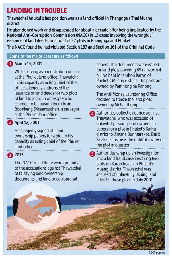 In 2010 trok de National Anti-Corruption Commission aan de bel. Ze oordeelde dat Thawatchai als registrar (griffier) schuldig was aan grof plichtsverzuim, misdadig misbruik van macht en vervalsing van documenten. Vier maanden na zijn verdwijning had het Land Department al aangifte gedaan tegen Thawatchai en medeplichtingen. Volgens de politie vroegen de ambtenaren 1,5 tot 3 miljoen baht voor het vervalsen van documenten. Drie van Thawatchai’s collega’s werden in 2006 veroordeeld. Een heeft zijn straf uitgezeten, een zit nog gevangen en een werd begin dit jaar vrijgelaten nadat hij een beroepsprocedure had gewonnen.