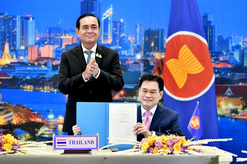 Prime Minister Prayut Chan-o-cha witnesses the signing of the Regional Comprehensive Economic Partnership by Commerce Minister Jurin Laksanawisit at Government House on Nov 15, 2020. Thailand ratified the pact on Feb 15 this year and China endorsed the agreement on Monday.